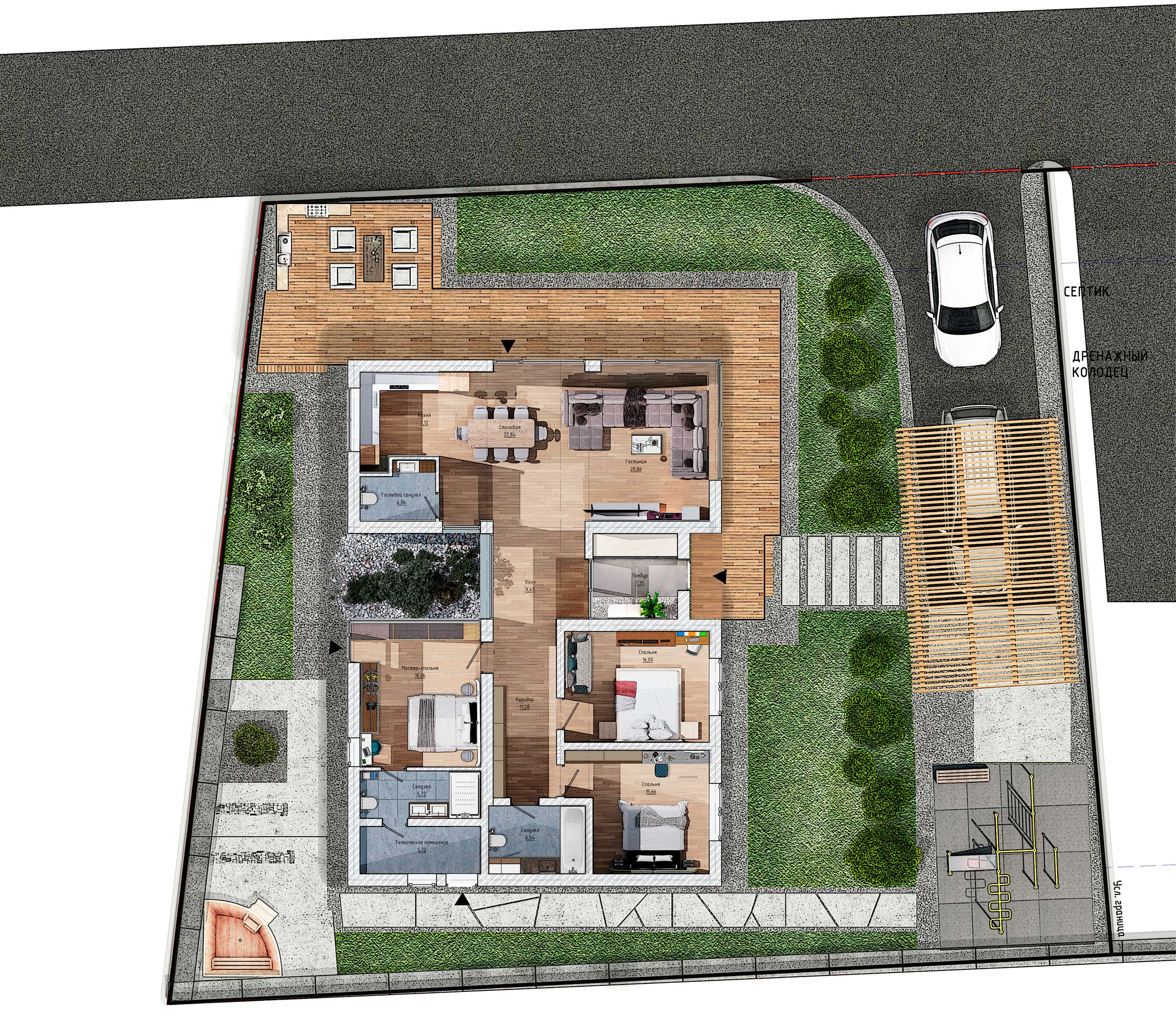 — графитовые панели с вертикальной фрезеровкой, образующие яркий архитектурный акцент на торцевой стене.
