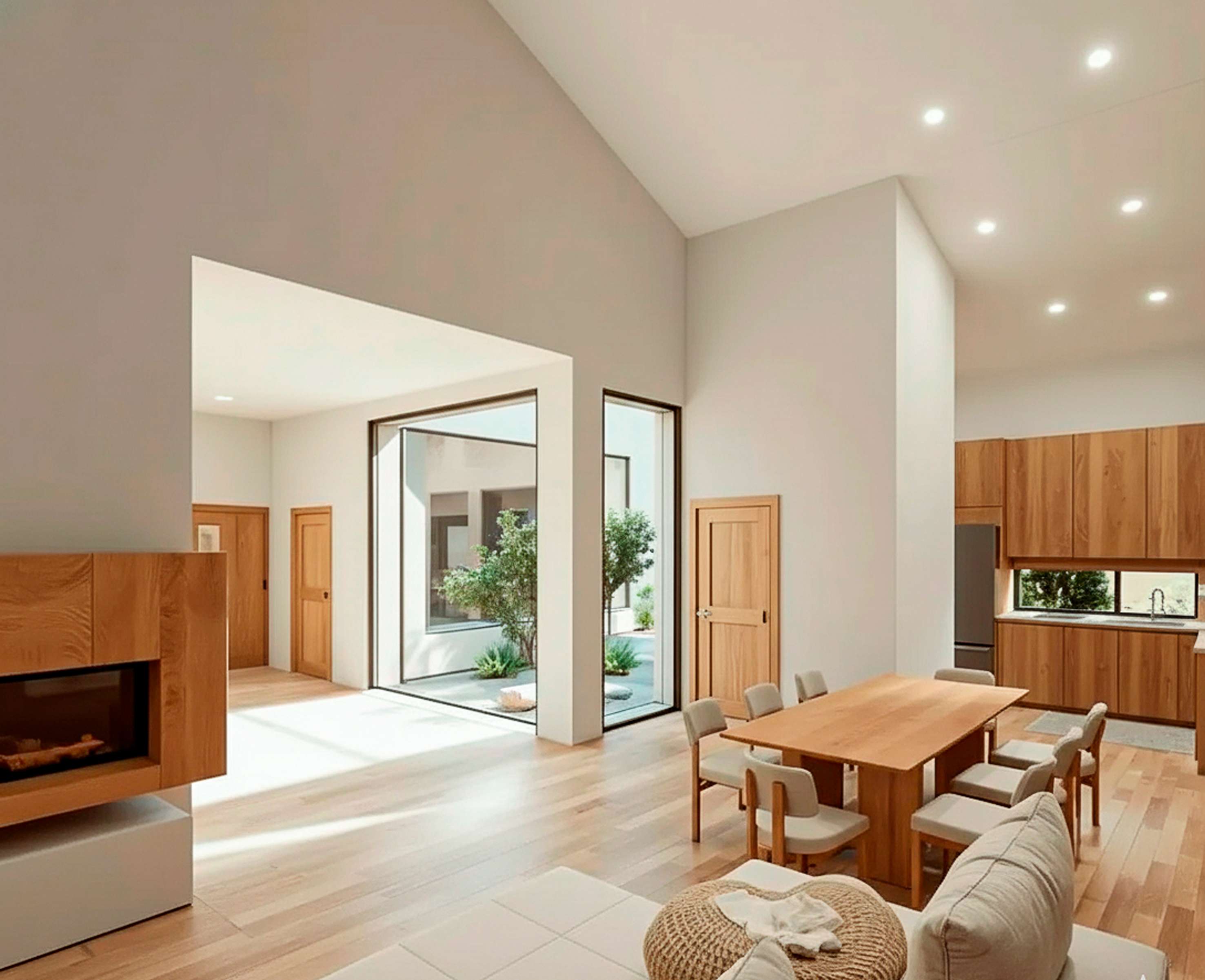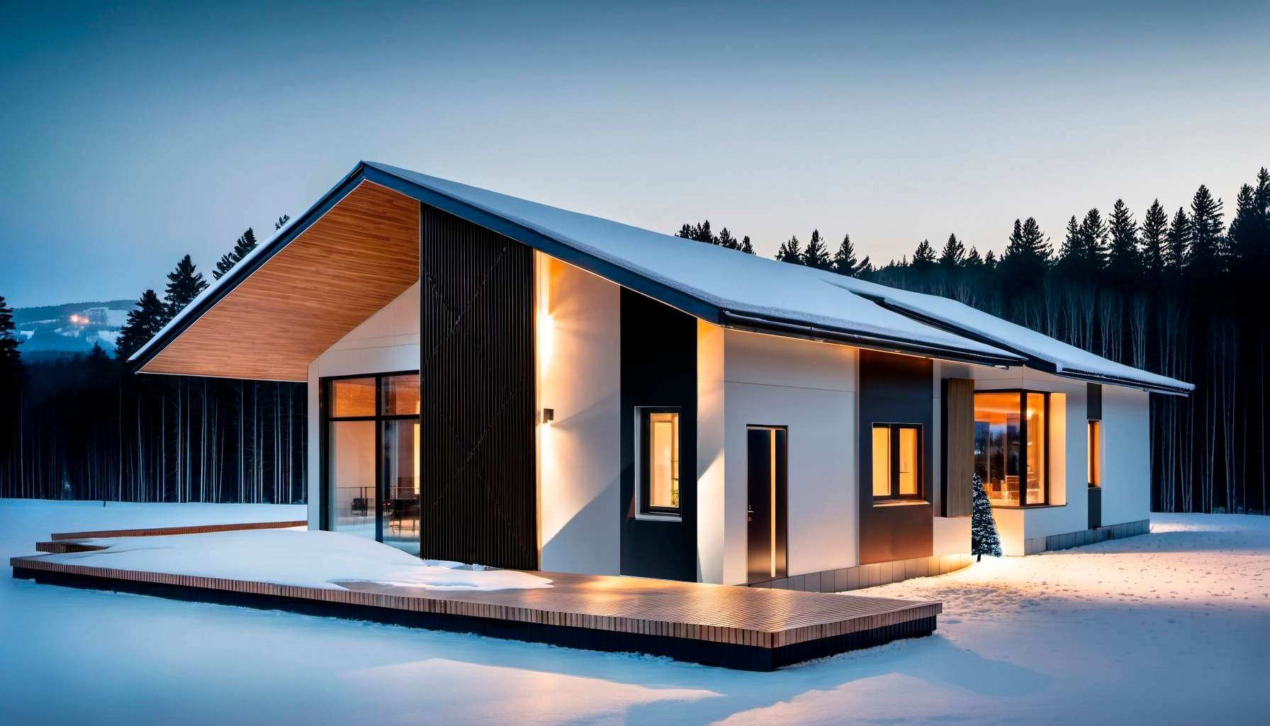Широкие панорамные окна в зонах гостиной и кухни создают открытость и визуальную связь с окружающей природой. Прозрачные плоскости интегрируют интерьер в ландшафт, а тёплый внутренний свет формирует уютный контраст