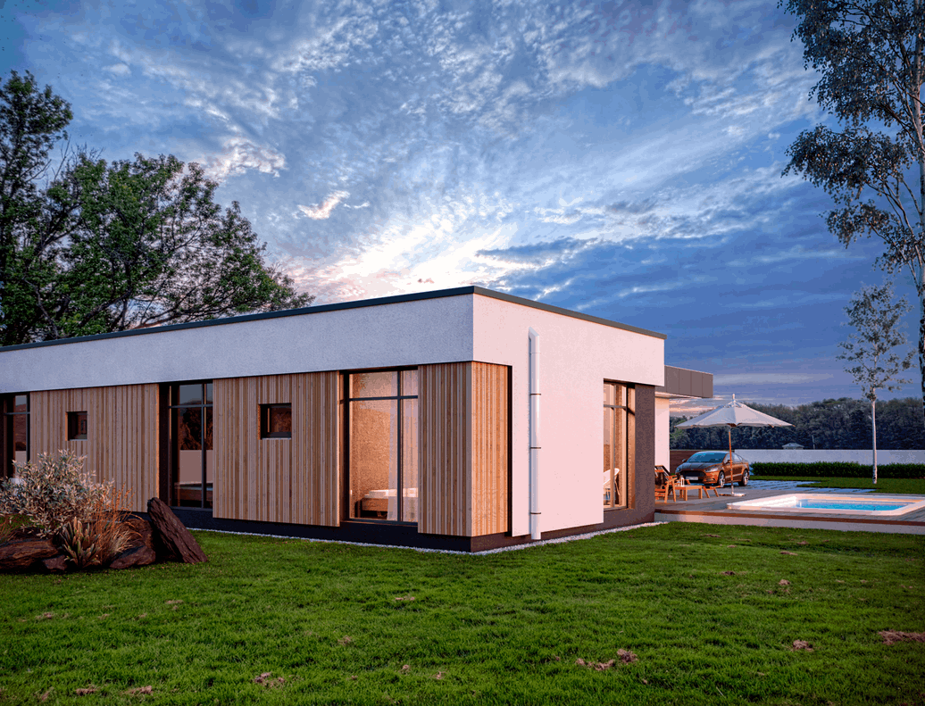 Современный одноэтажный дом выполнен в духе минимализма и функциональной эстетики, где каждая линия и материал подчинены идее баланса между формой, светом и пространством. Архитектура строится на контрасте текстур — гладкой штукатурки, фактурного камня и натурального дерева, — создавая богатую, но сдержанную палитру фасада.
